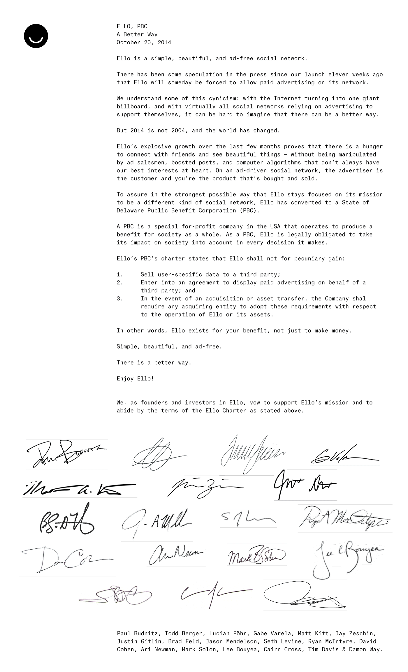 Along with the financing we’ve also reincorporated Ello as a PBC (public benefit corporation). PBC is a relatively new concept and this is Foundry’s first PBC investment. The idea is reasonably simple – being a PBC allows us to write into our Charter (the founding document of our business from a legal perspective) that we exist to serve not just our shareholders, but also to uphold specific values. In this case we’ve included in our charter a prohibition for selling advertising and user data. While the charter is an agreement among and between the shareholders of Ello, we took the unusual step of essentially restating our mission in our charter because we wanted to emphasize our commitment to building a business on these terms.