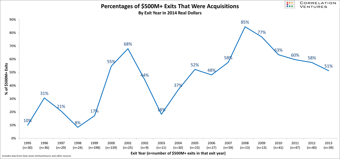 Today I’m focusing on companies in those top return categories with some new data from Correlation that show the percentage of large exits (>$500M) that are generated through M&A vs. IPO (quick side note: I seriously love how much information Correlation collects and how free they are in letting me post about it – as a reminder, Correlation is a firm that co-invests based on an algorithm that predicts the success of the a company; we’re in a few deals together and I can tell you the process is quick and painless; end of advertisement, but seriously – these data are from their work and the fact that they’re so interesting shows why the model works for them).