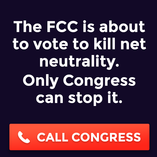 We have just hours. The FCC is about to vote to end net neutrality—breaking the fundamental principle of the open Internet—and only an avalanche of calls to Congress can stop it. So we decided to help “Break the Internet” on our sites. You can also support on Twitter, Tumblr, Youtube or in whatever wild creative way you can to get your audience to contact Congress. That’s how we win. Are you in?