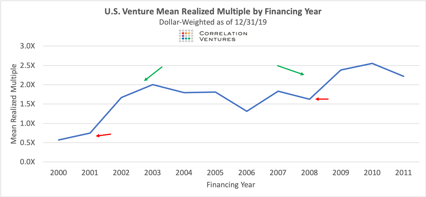 For those of you who are regular readers of this blog, you’ll know that I love data and have several times pulled data from Correlation Ventures (who have a huge proprietary database of venture financings dating back decades which they use to power their investment decisions) in an effort to answer interesting questions about the business and practice of venture capital (my favorite such post is here). Yesterday they put up an interesting post providing some actual data to back up the broader statement that downturns are good markets to invest into (beyond the headlines of great companies that were started in downturns – that’s great but anecdotal; this analysis looks at overall returns post downturn).