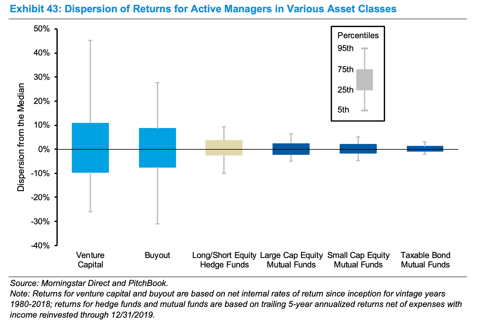 Some quick math highlights why this is the case. For example, assume a $100M fund with 30 investments. That’s a little over $3M per investment, and while there is some dispersion from the average across companies in a fund, it’s not a bad way to model it. But from the outcomes chart above (the first one) we know that on average only 1 (actually just fewer than 1) company in that group of 30 will return between 10x and 20x. And less than 1 will return 20x or greater (I’m using the company averages, the dollar averages are on a per round basis, which would make these numbers even worse). A 20x returner for a fund that on average invests $3-$3.5M in a company doesn’t return that fund. Taking the most aggressive end of these numbers would still only have this one company returning 70% of the fund’s capital. If you were going to have several of these, of course, that would work out for your fund. IRR will depend on the timing of cash flows but as a quick rule of thumb, venture funds look to return at least 3 times the invested capital – after fees, so more like 3.5x on a gross basis. That’s pretty hard to do without a true outlier return (50x+) and/or consistency of 10x+ returns that is simply hard to generate. And here’s where the dispersion comes in. The best funds do have multiple companies that return in that range. Or higher. But that means the median fund doesn’t have any. And that is why the average venture fund isn’t actually a particularly good investment and also why so many venture funds fail to return capital.