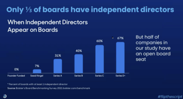 - One surprising thing that Bolster found in their board benchmarking study is that only 1 in 3 private boards today have independent directors. That’s not uncommon for the earliest boards, but it surprised me that overall the rate was this high. It’s a missed opportunity for companies to gain valuable insight, perspective, and network extension.