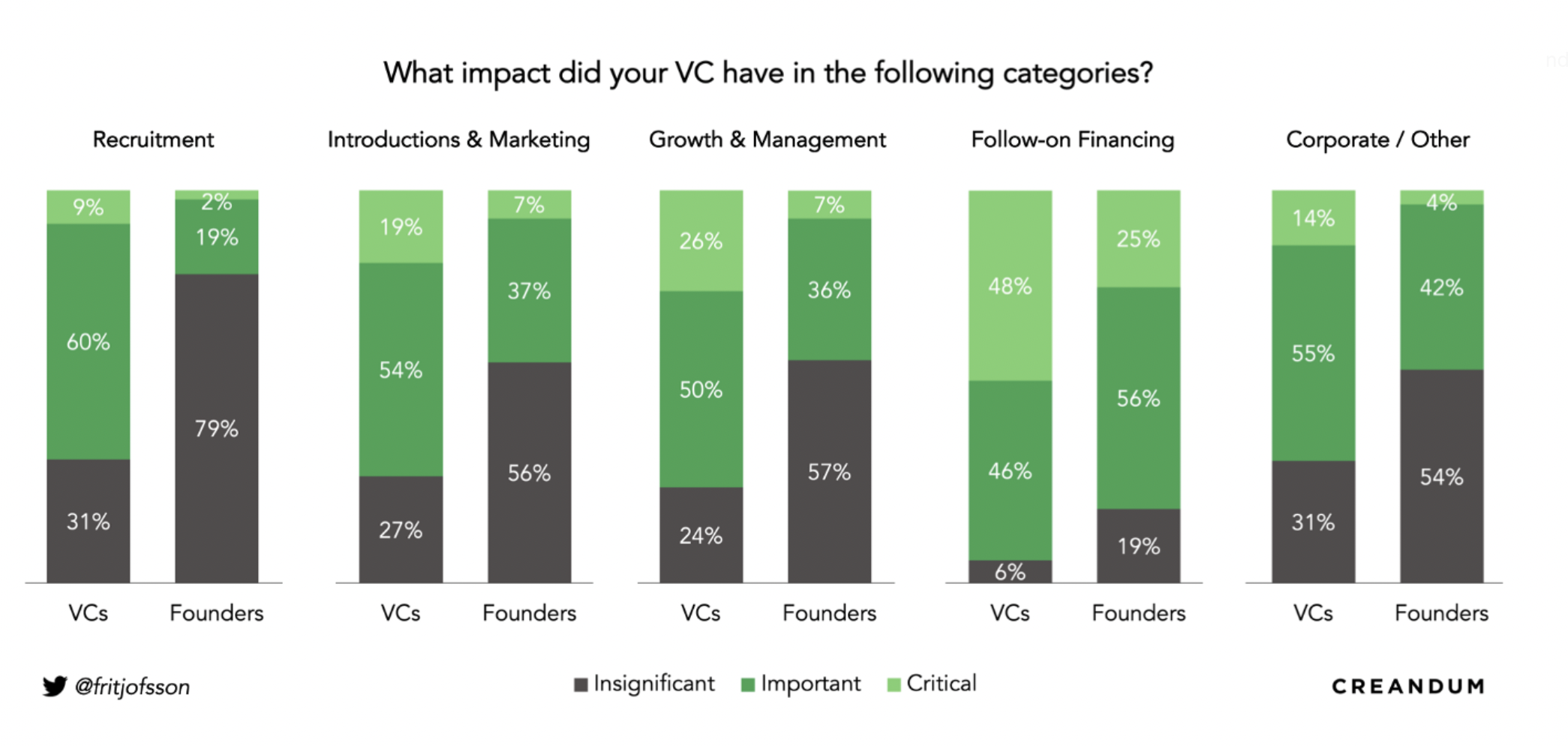 Interestingly, and I suppose not all that surprisingly, VCs have a very different perspective on the value they’re bringing. The two graphs below highlight this across a number of different areas of impact.