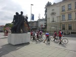 Stopping to confer with our guide Ron in a town square