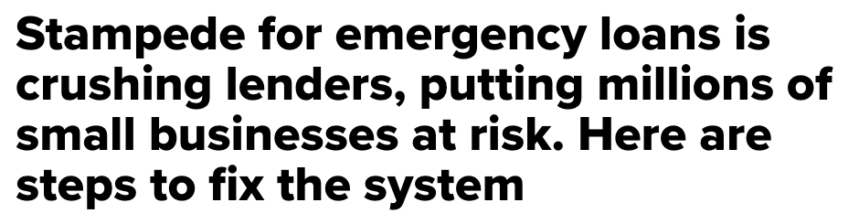Elizabeth Macbride and I wrote an OpEd piece that was posted on CNBC this morning addressing what we believe to be significant shortcomings of the CARES Act and the SBA’s Payroll Protection Program (PPP). Specifically how the stimulus is failing to meet the needs of small businesses around America in this time of crisis. This is urgent and needs to be addressed as soon as possible. I’d encourage you to click through to read the full piece, but below I’ve outlined the key recommendations we make at the end of the OpEd: