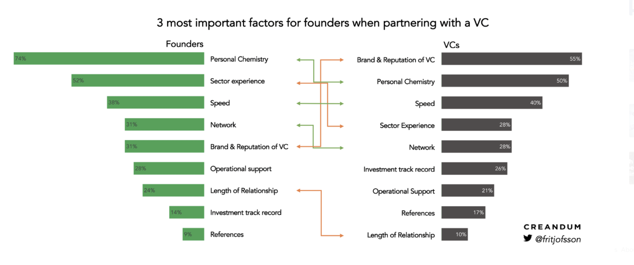 And fascinating to me that VCs believe “brand” is the most important thing that they offer vs where it shows up on the CEO list (#5, behind things like ‘personal chemistry,’ and ‘network’). I wish the survey had broken out “brand” from “reputation” because I suspect the gap around brand alone is actually quite a bit larger (although I don’t think that will stop many firms from focusing on their branding and marketing efforts…). Also standing out from the graphs above is the gap between how much VCs think they’re helping with recruitment vs CEOs ratings of the same (69% of VCs think they’re making a significant contribution to recruiting while 79% of CEOs say that they’re not).